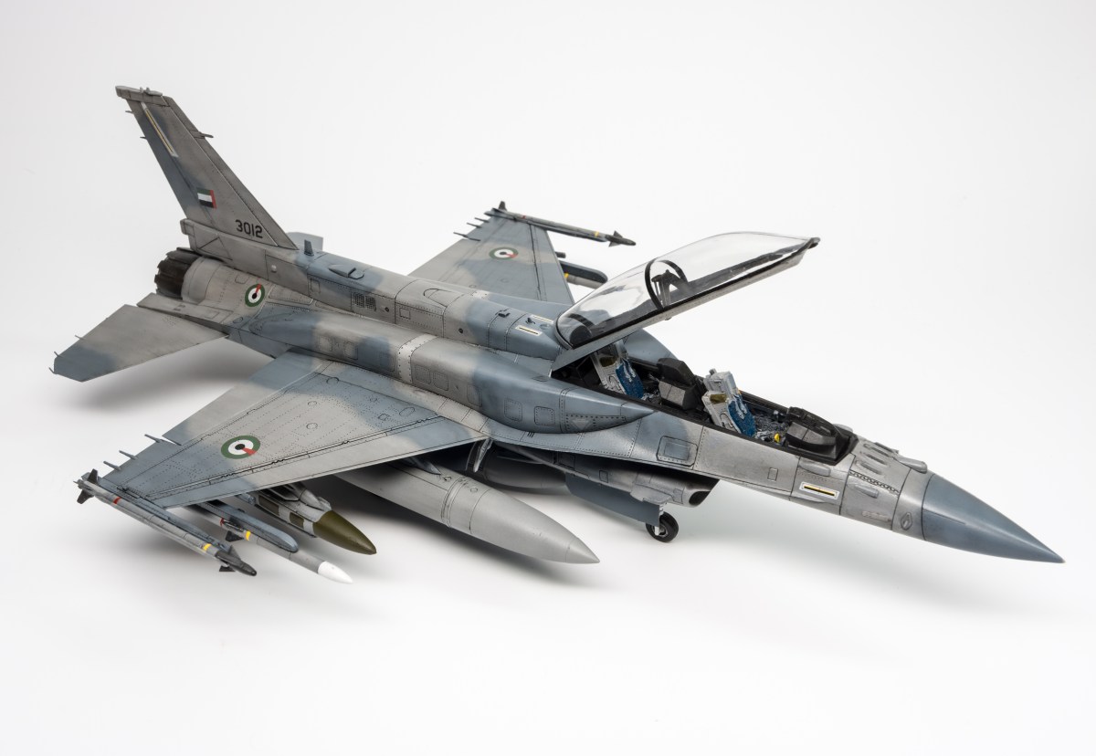 This is Kinetic’s F-16F Block 60, modeled in UAE service. the kit has great detail but is lacking in fit and sprue design, one AIM-9M that the kit comes with was broken in the box. otherwise the kit is quite good but I wouldn’t recommend it to a new modeler. The kit comes with a lot of external stores, enough to fill multiple aircraft so +1 to Kinetic for that. painted with Tamiya acrylics and weathered with an oil wash.