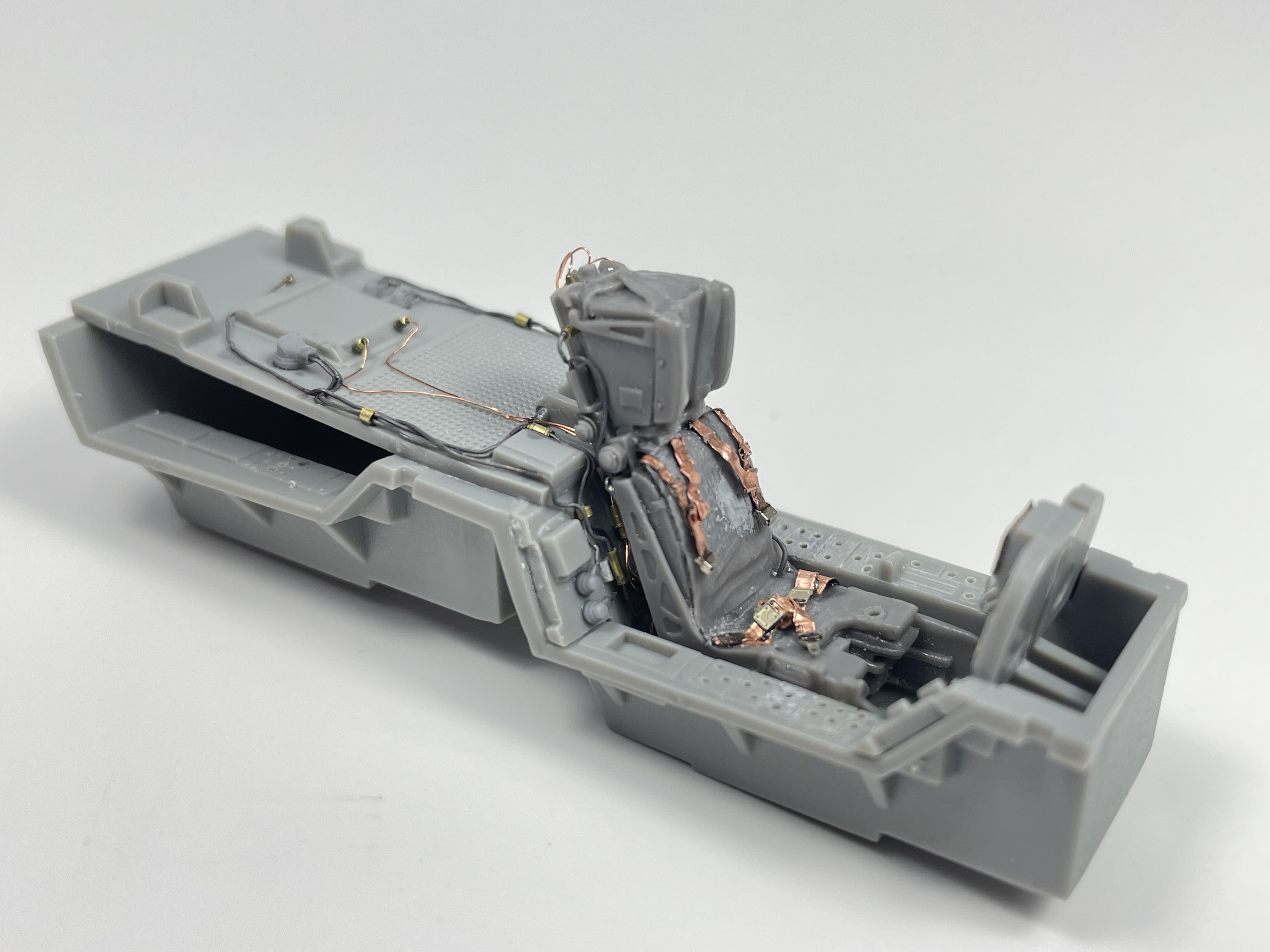 Construction unsurprisingly starts with the cockpit. I took my time here, spending a few extra days to get all the details I wanted added. Lots of extra wiring was added to the resin Aires seat and the end result really paid off. Lead and copper wire was used (0.1, 0.2 widths ) along with brass micro-tubes from Albion alloys. Some 3d Printed avionics from Anyz were also used. I coiled 0.1mm copper wire to create a avionics cable in roughly the same position it is in real life.