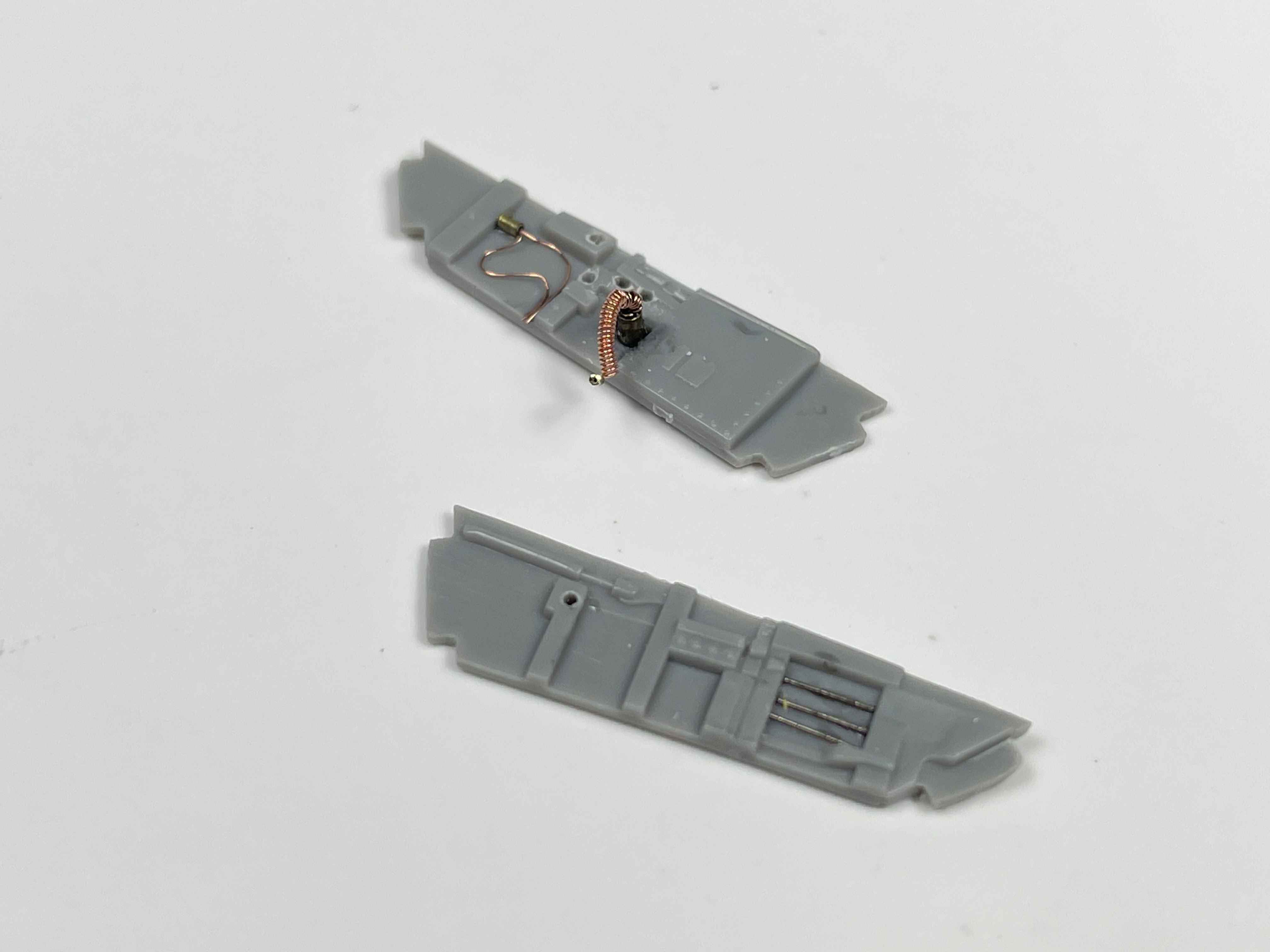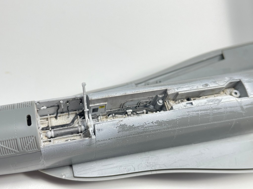 Kinetic’s gear bays are quire well detailed OOB. None the less, I still wanted to add some extra detail here for the experience. After looking at various reference photos I could tell that they were incredibly busy and complicated, and the extra piping would help increase the realism. I found it difficult to work in the nose gear wheel well as there really isn’t a lot of space to work in. As such, most of my detailing efforts went into the main gear bay. I painted the bays in standard Tamiya white and picked out details with various metal shades along with Tamiya black.