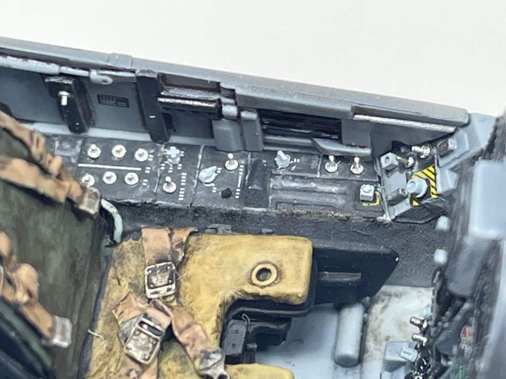 The cockpit was painted over a few days, It was surprisingly straightforward. After adding the X-22 clear coat, the real fun could begin, dealing the cockpit. For this I used Anyz and Airscale decals. Anyz makes really great “miscellaneous” decals and cockpit switch selector indicators. Airscale has good warning and dial decals.