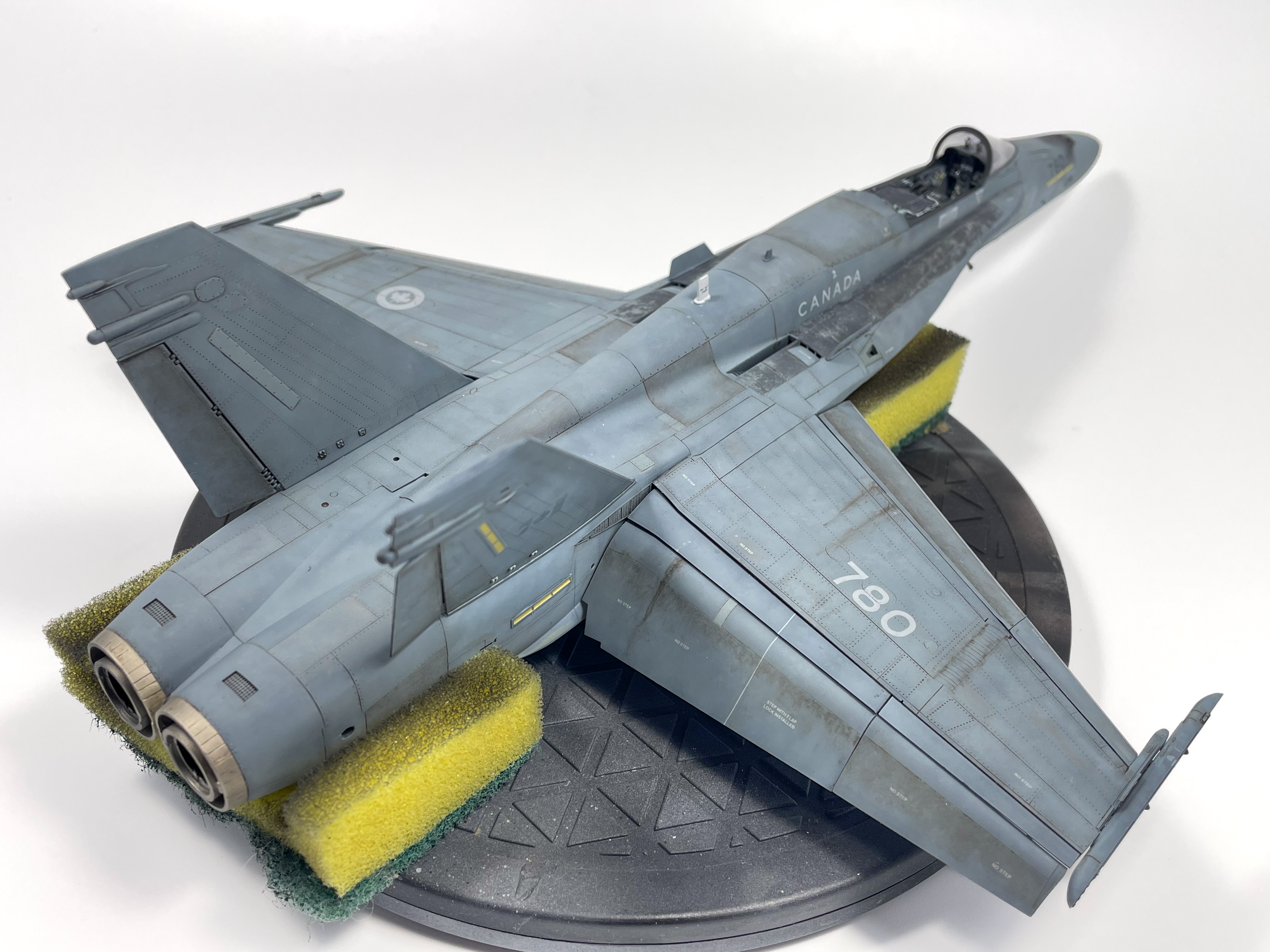 I like to use this tactic because it’s so versatile IMO. If you want only a very subtle effect you can load your brush up with thinner and blot out 95% of the paint. On the other side you can leave most of it and it’ll create a very striking contrast. After that I also did some various streaking effects on the wing. This is a common effect to create for Cf-18’s as the streaking fluid is typically very visible in a lot of reference photos. I hit the model with a coat of VMS Matte and the weathering stage was complete!