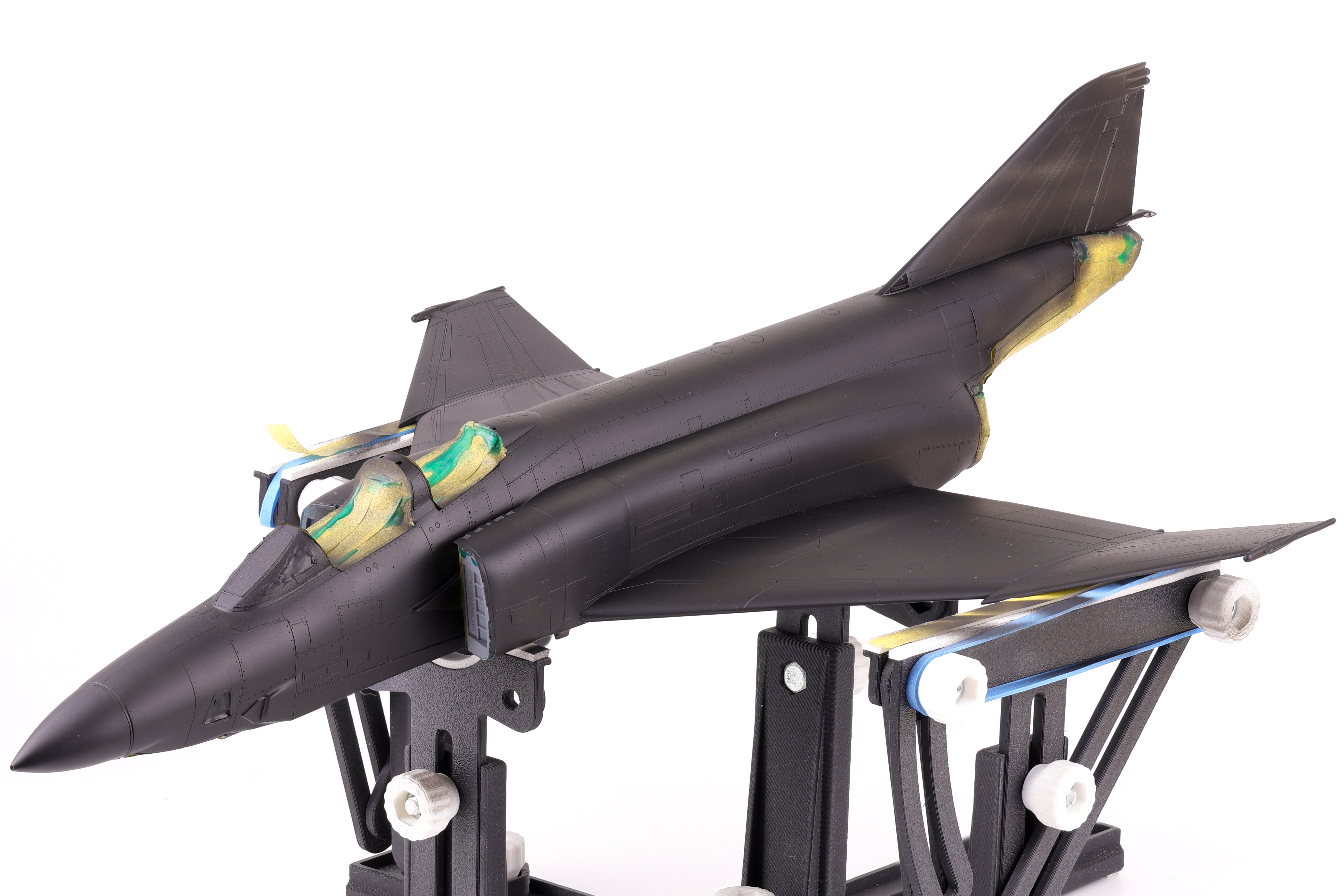 With this initial camouflage coat down, I then turned my attention to other areas that needed to be addressed. This included adding color discoloration to selected panels, painting the markings as well as the radome and anti-glare shield. Also of note was one of the scheme decals, a triangular graphic present on the tail of this aircraft. I opted to apply this decal at this time because from reference photos I could tell that it was very faded and barely noticeable on the real aircraft. To recreate this effect, I chose to paint over the applied decal prior to sealing my work in a gloss varnish