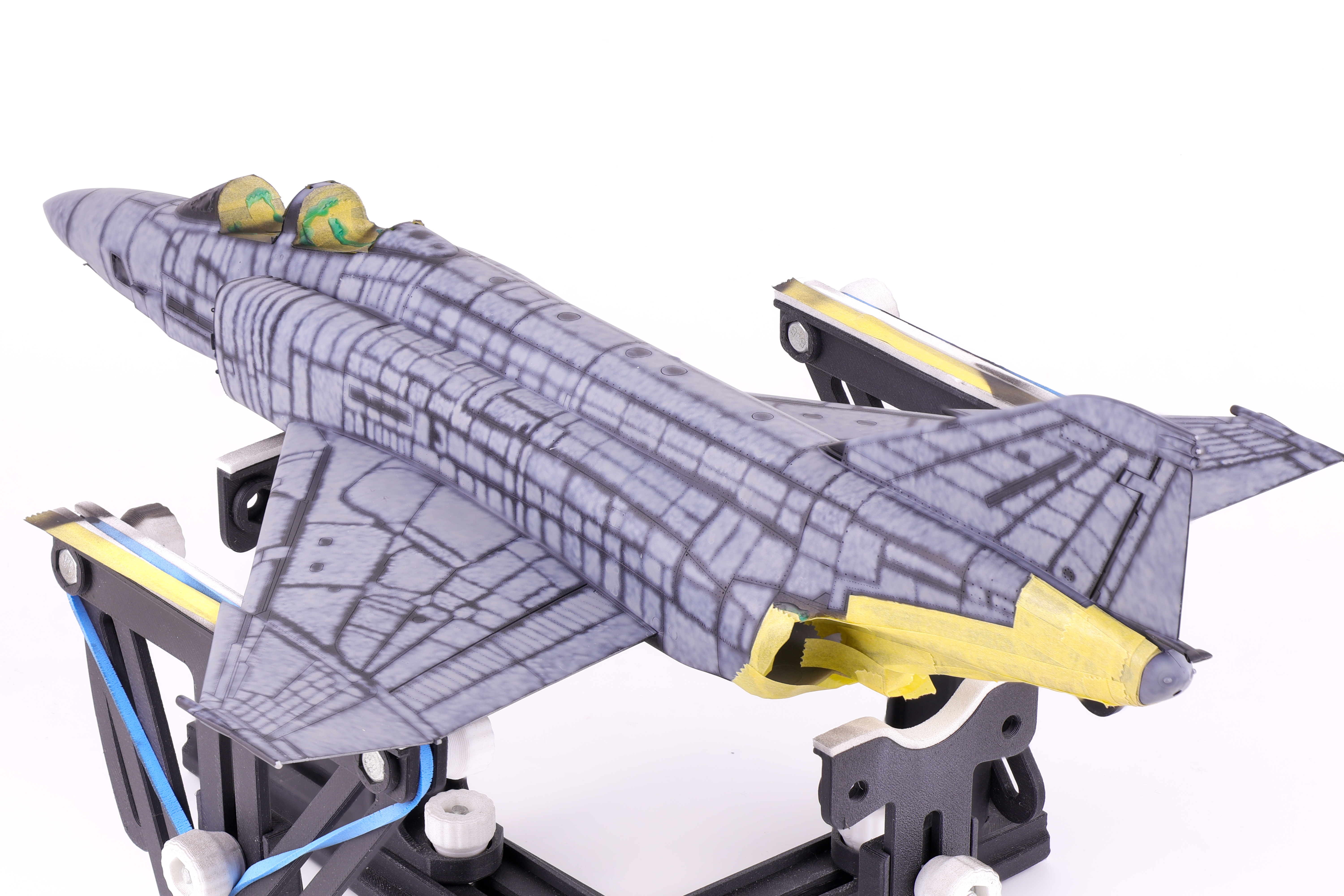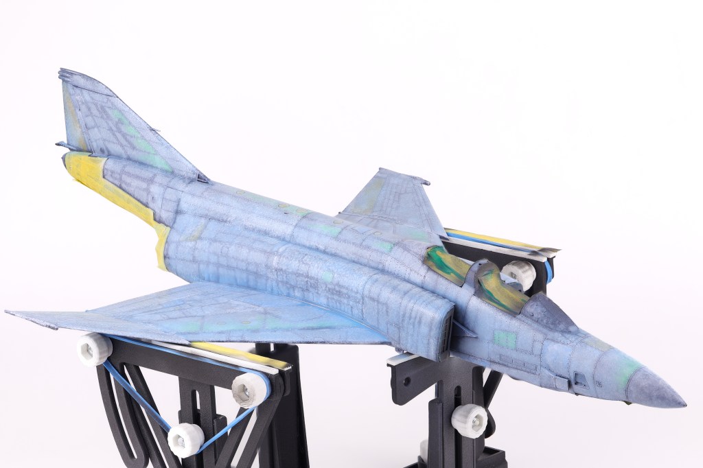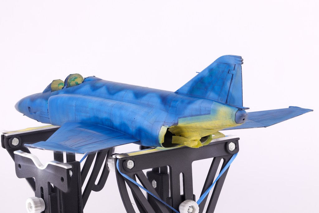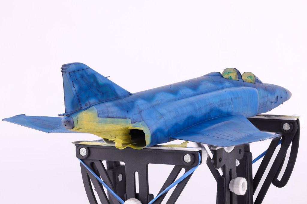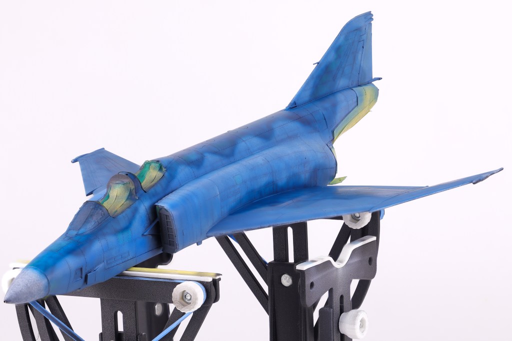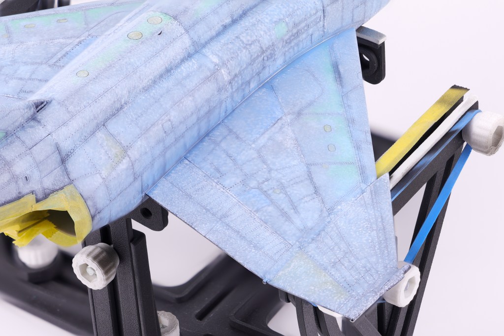 I then got to work adding some variation to the pre-shading, opting to scatter some different colours on select panels. In the end this effect was not as apparent as I had hoped but It’s still fun to play around with new approaches to techniques. The next step would be to begin blending everything together in two blend coats. The first was a thinned down coat of Mr. Color JASDF “Light Blue Impulse” which tinted the pre shading to be more in line with the final colours.