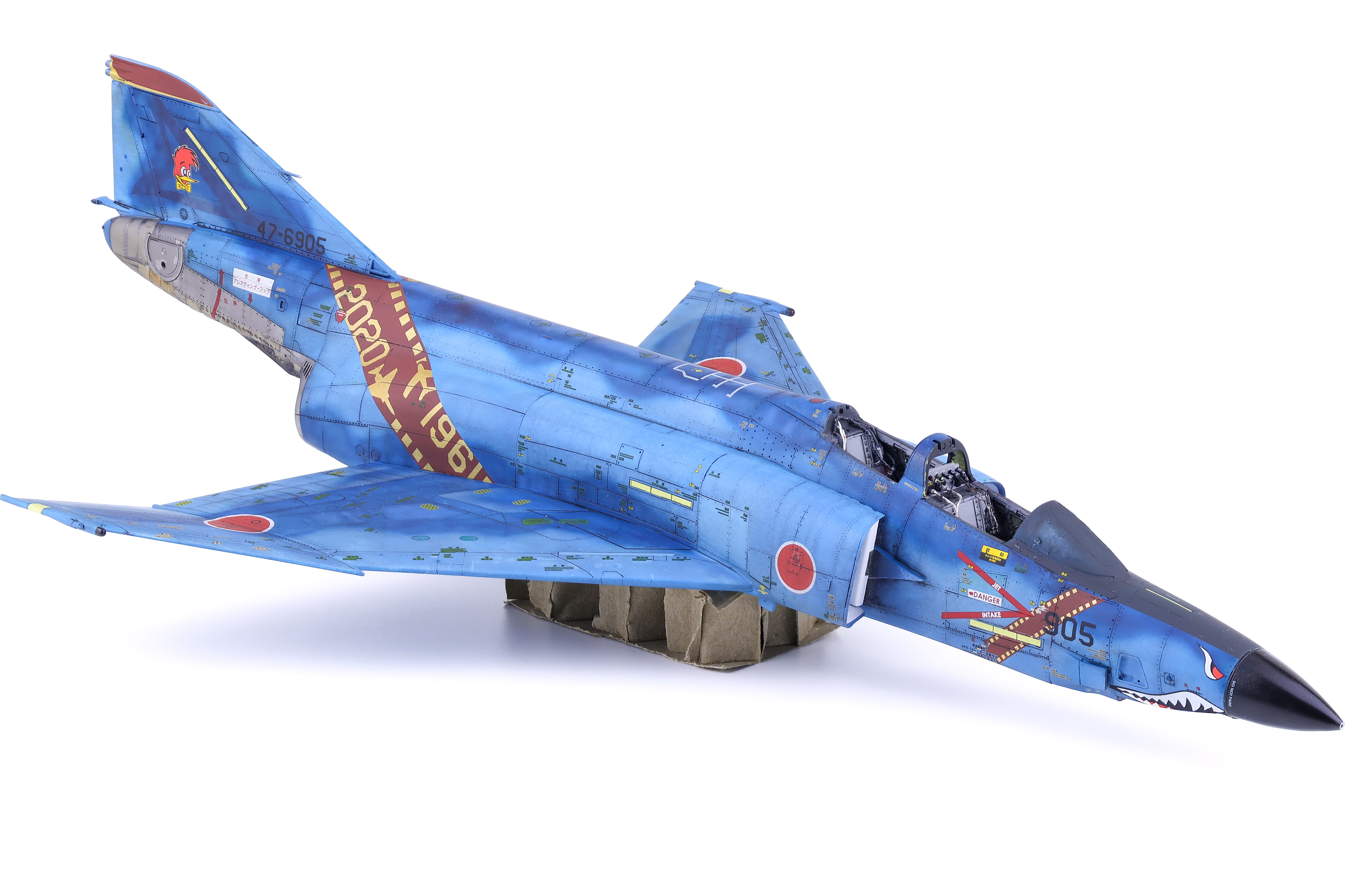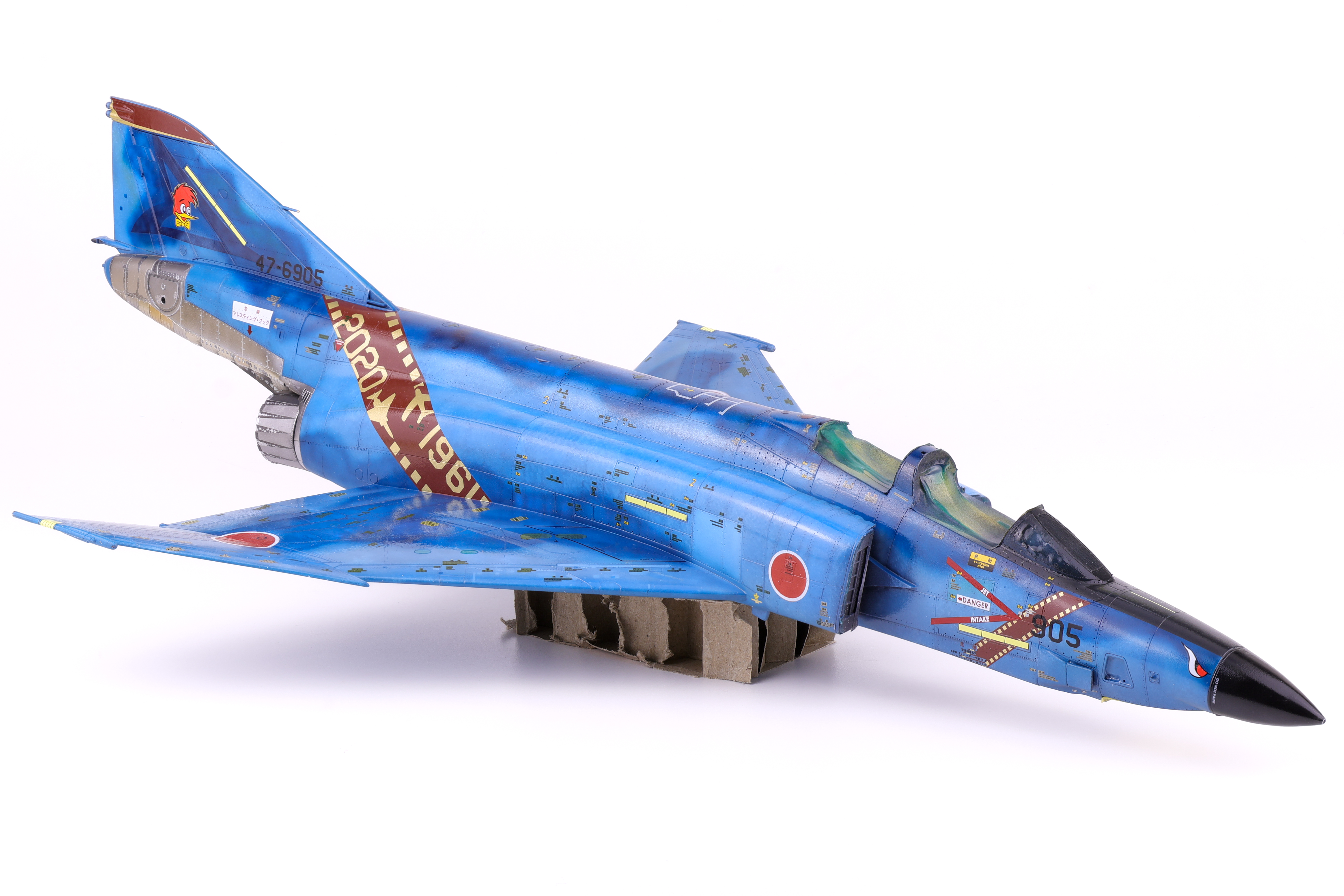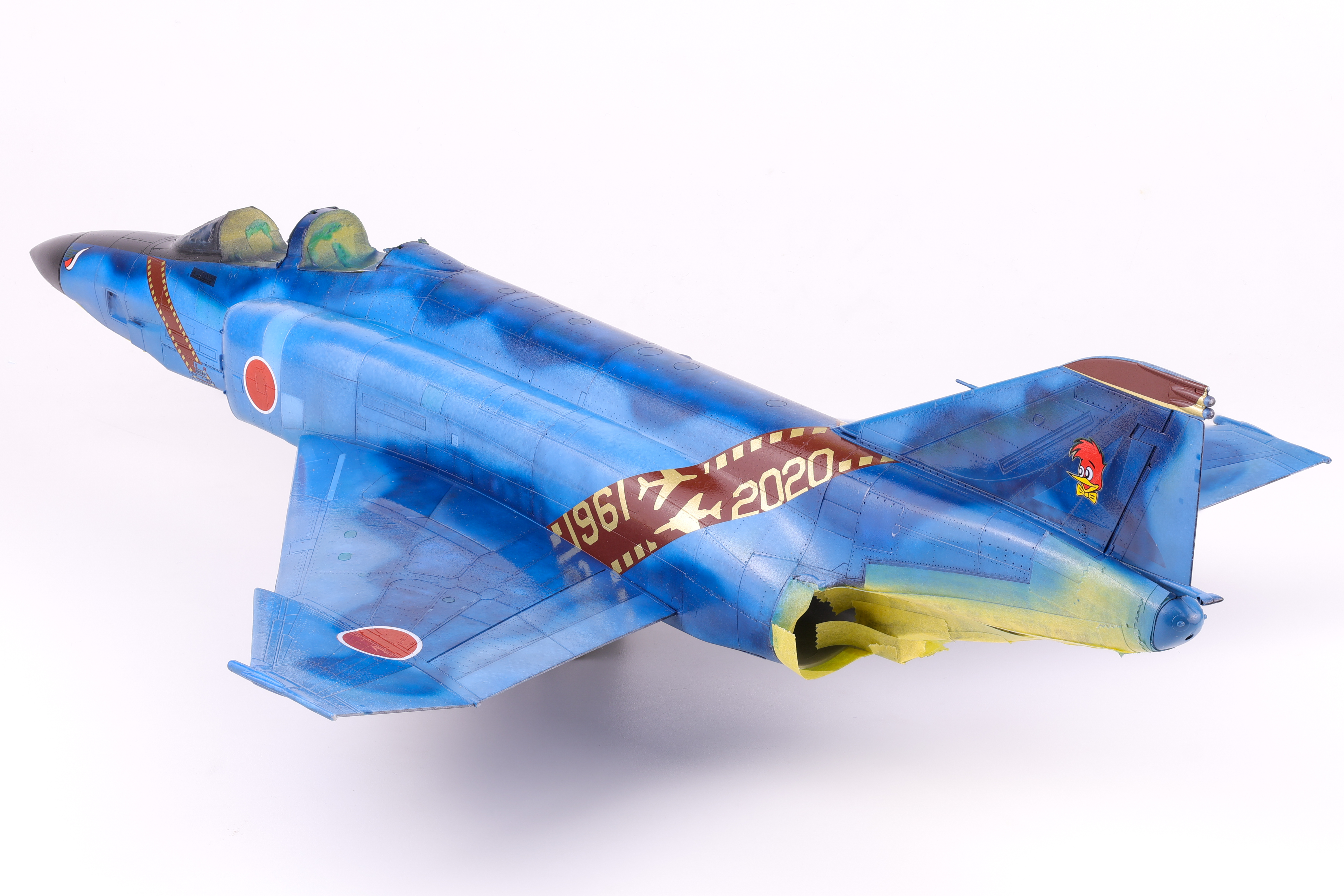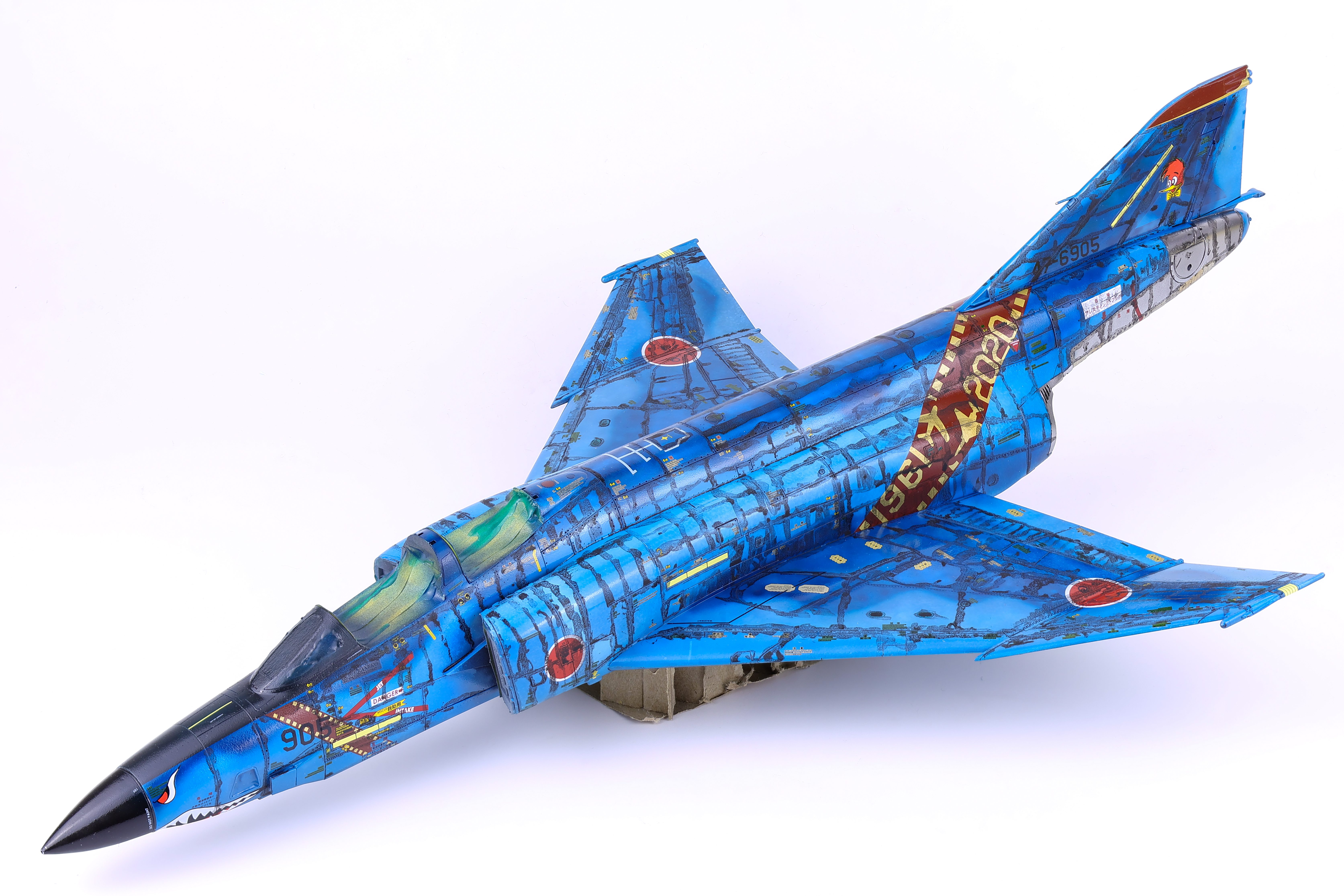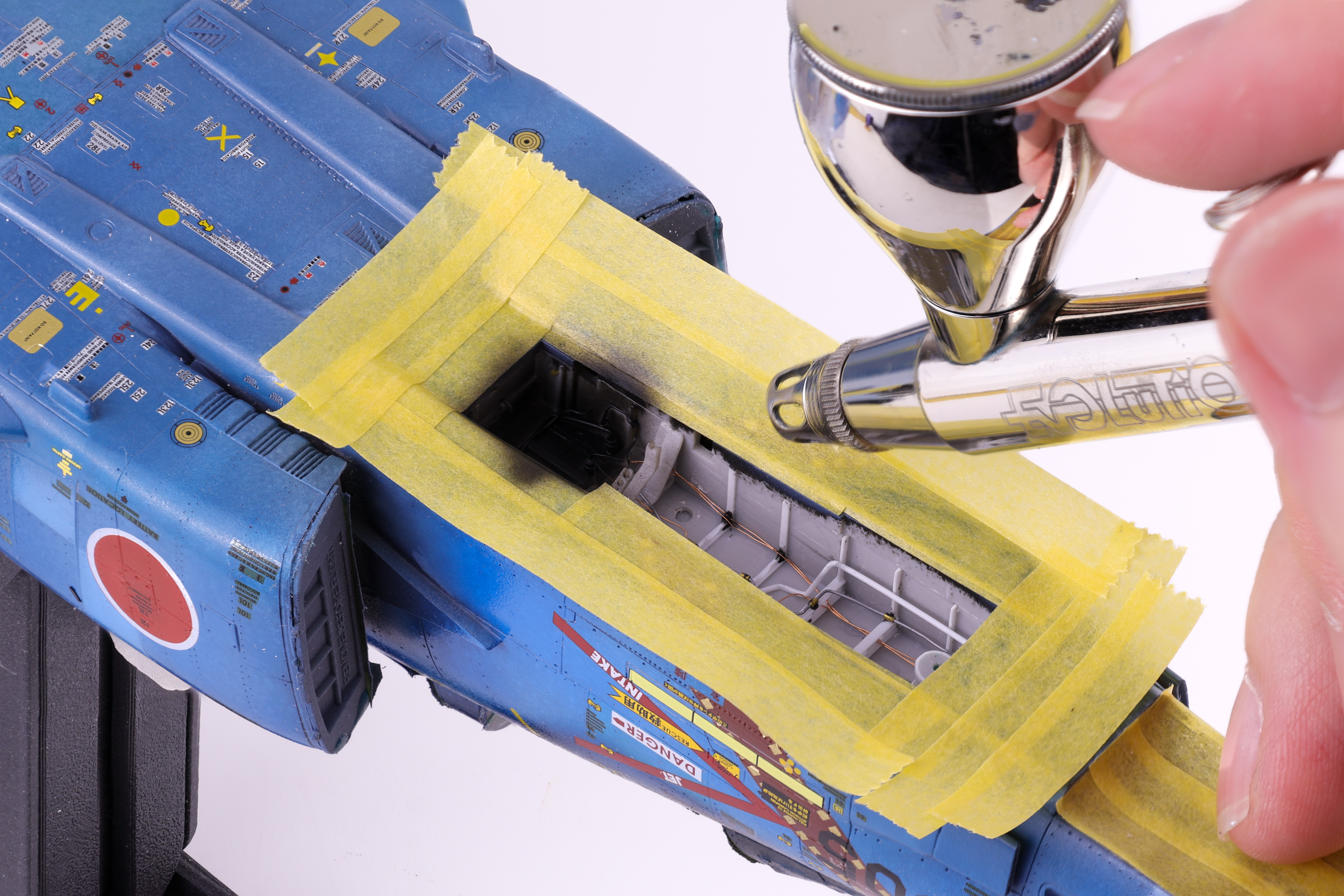 With the decals more or less completed I was able to move on to weathering. With the amount of pre-shading work completed, I knew that I wanted to keep the weathering light as to not overpower the paintwork. I opted for a simple dark wash and some light streaking effects. After these were applied, I applied a flat coat to keep everything together. With the flat coat done it was finally time to unmask the canopy and camera bay.