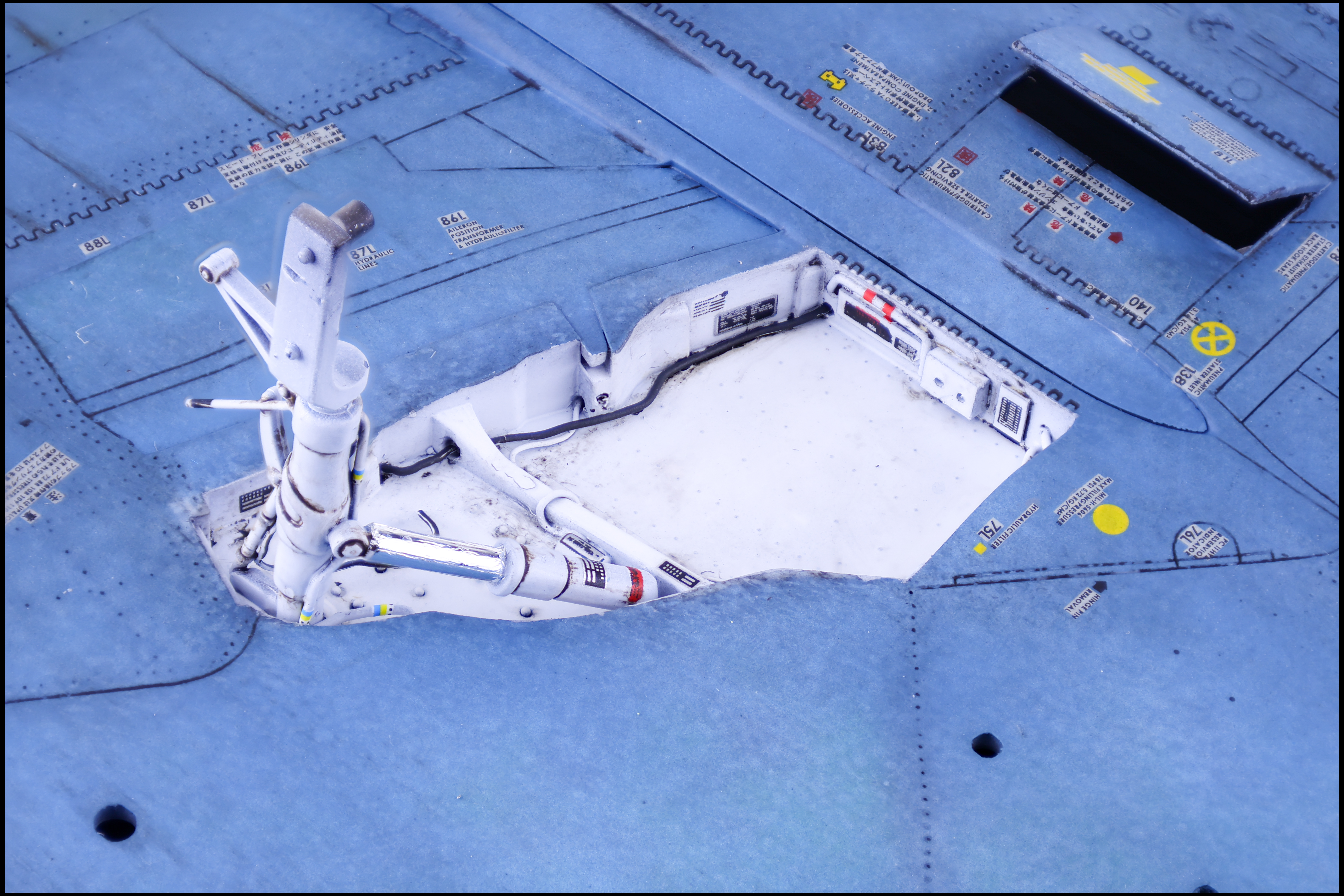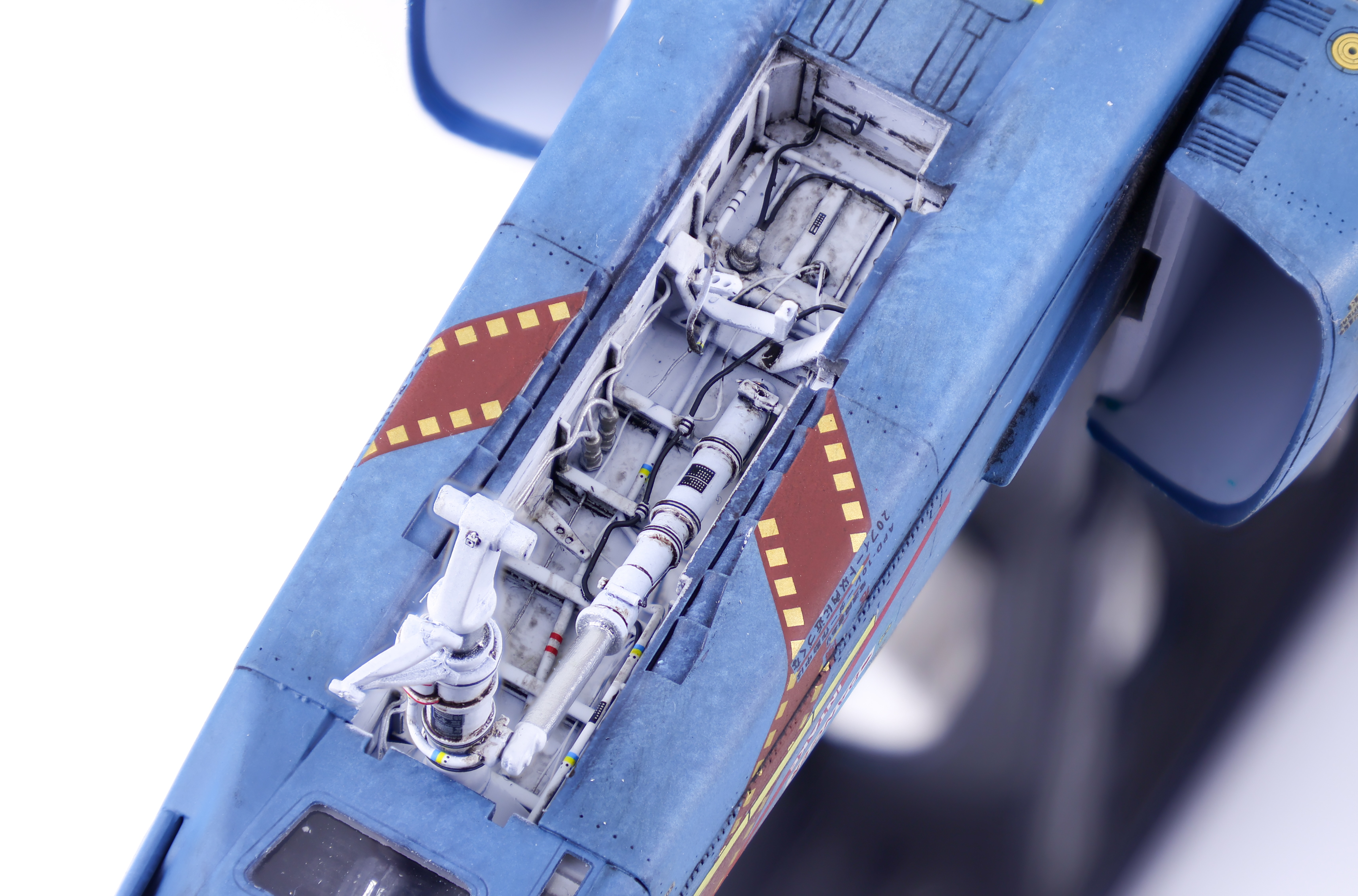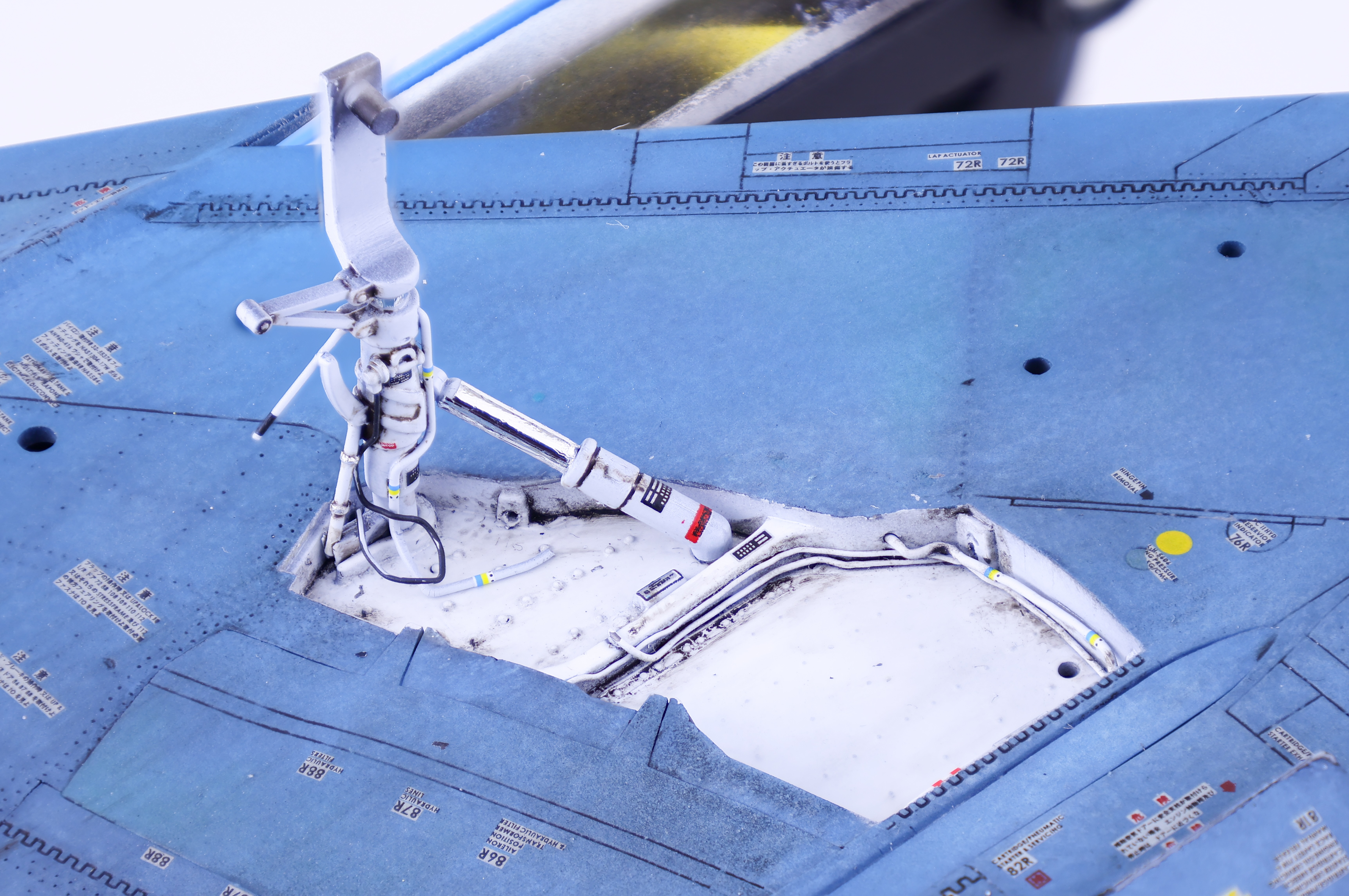 At this late stage of the build the last things left were the gear bays, the camera equipment and the canopy frames. I completed the gear and gear bays first so that I could get the model standing on its own legs. Painting and weathering were pretty straightforward in this area, just some Gloss white over black primer before adding some decals and weathering in the form of a brown oil wash.