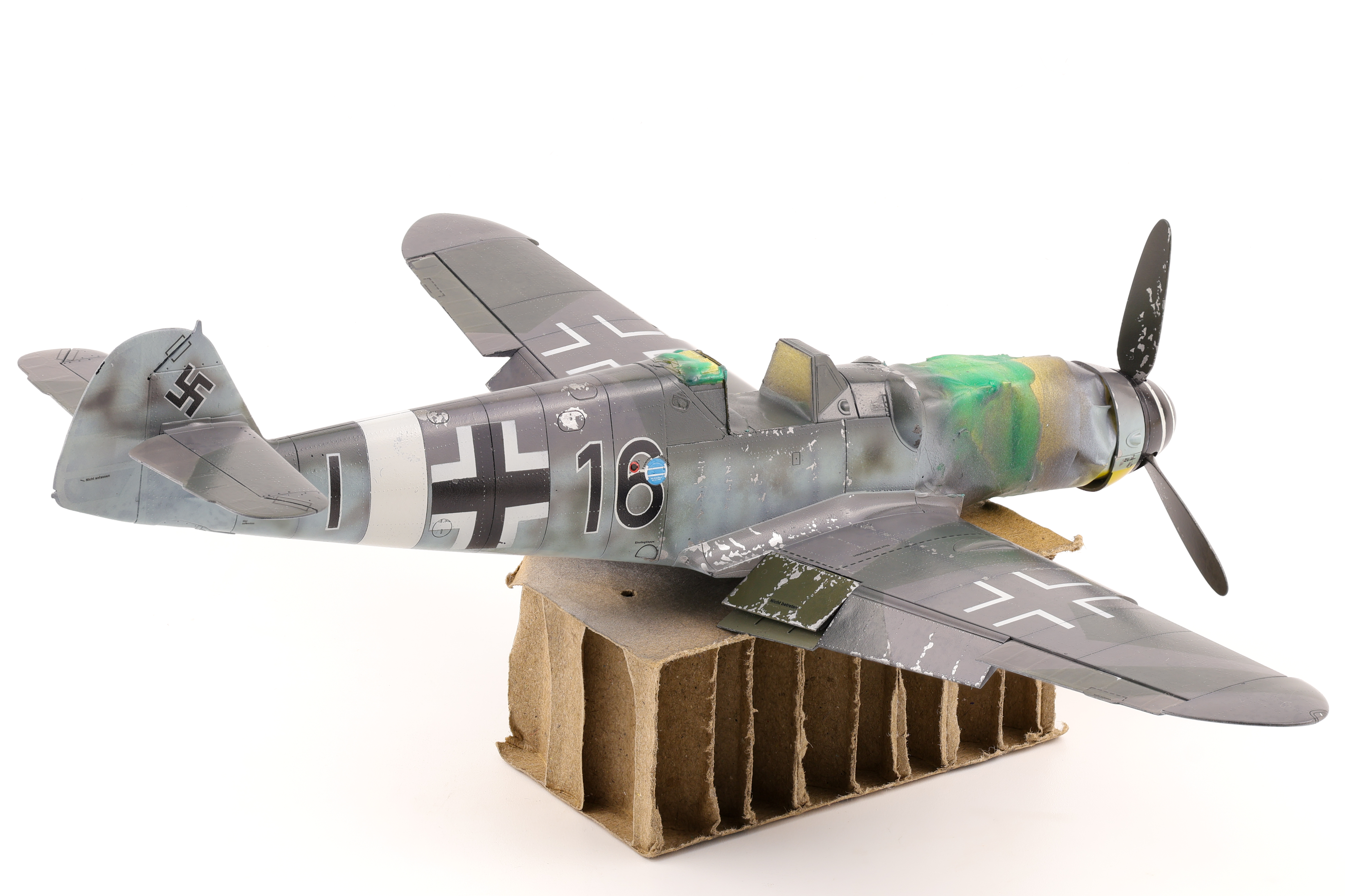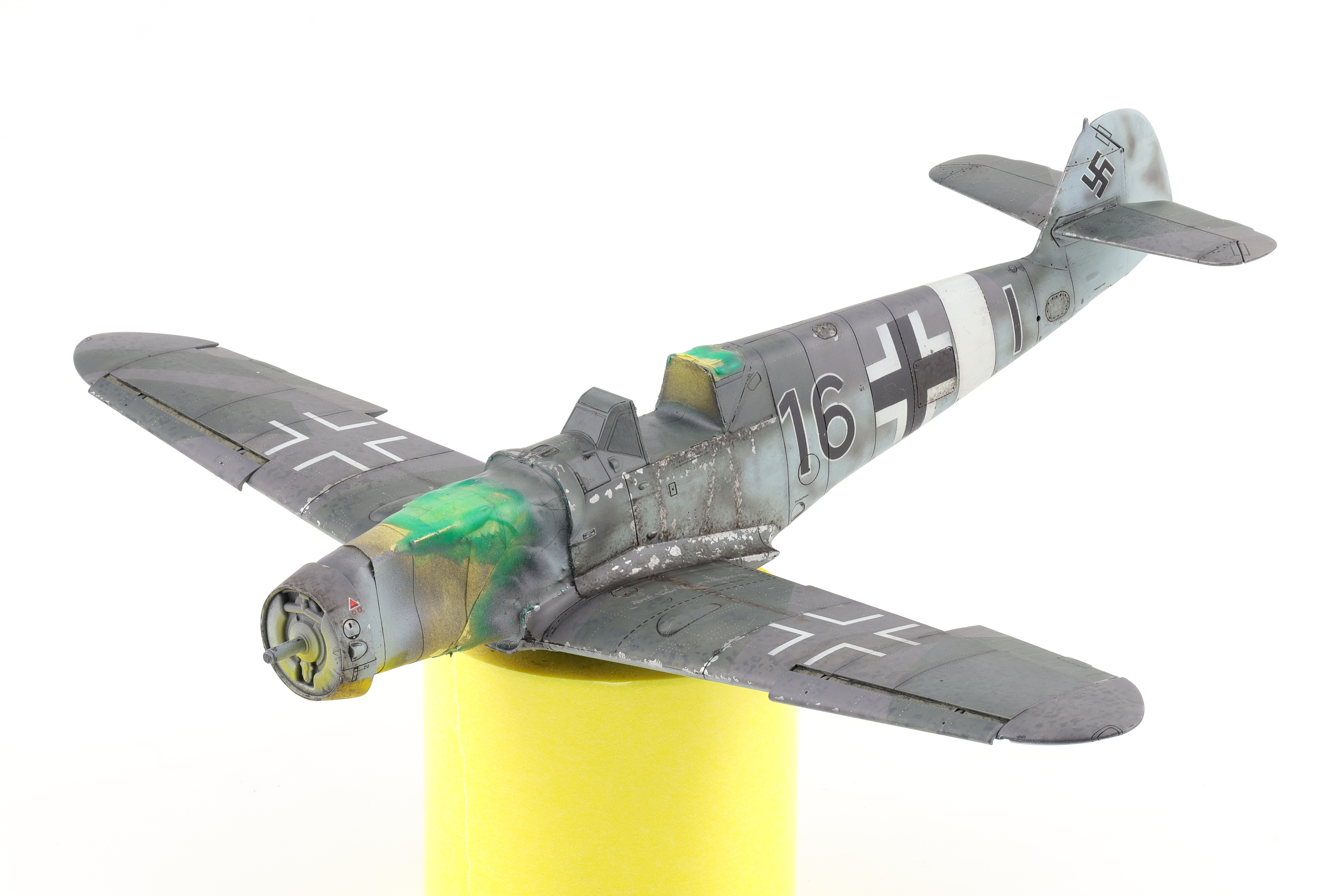 While the model was very glossy and smooth, I took the time to get some oil streaking effects done, again with oil paints. It had been some time since I had worked with oils and it was nice to return to the medium. I paid particular attention to the underside of the aircraft as this would where the heaviest streaking effects would concentrate.