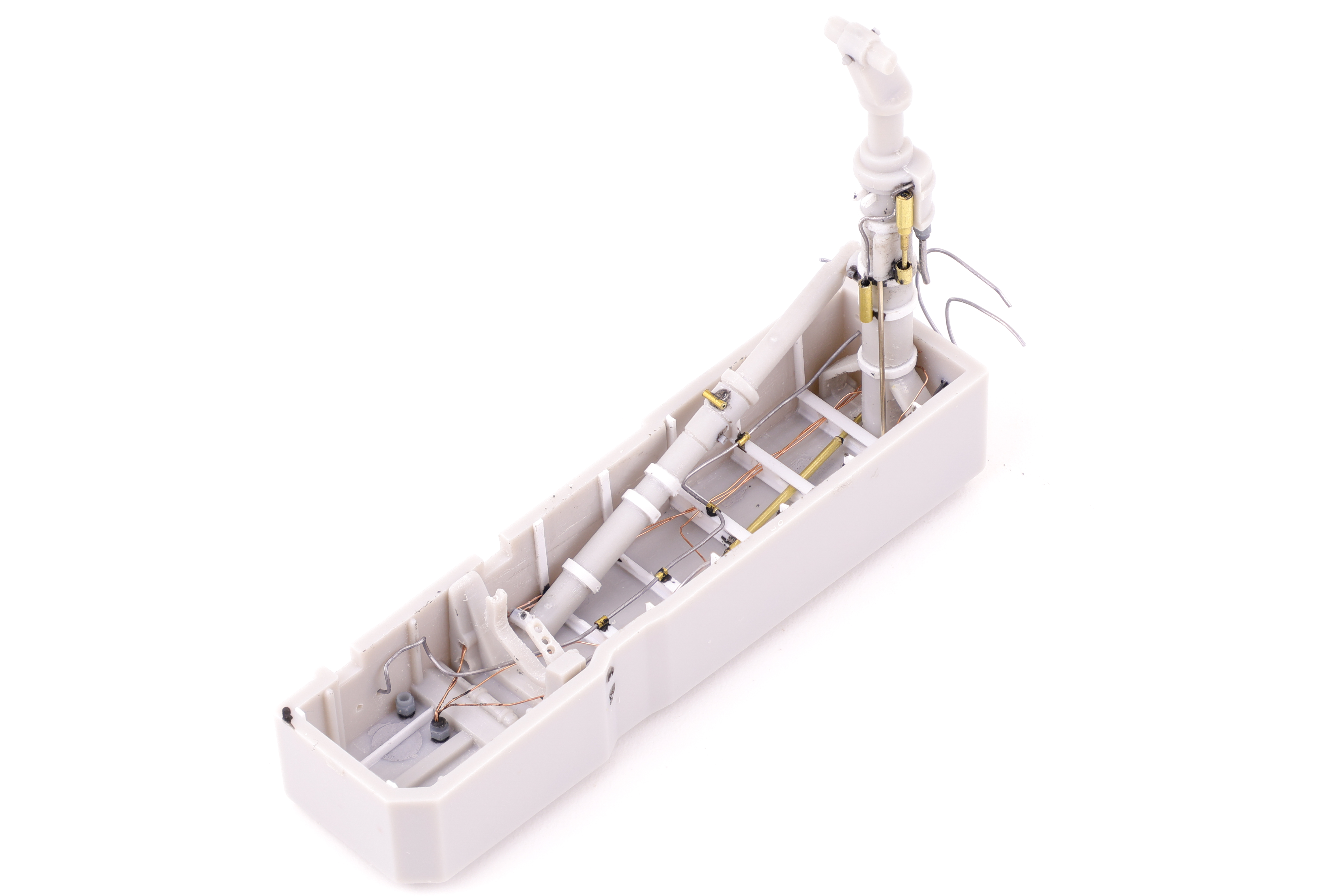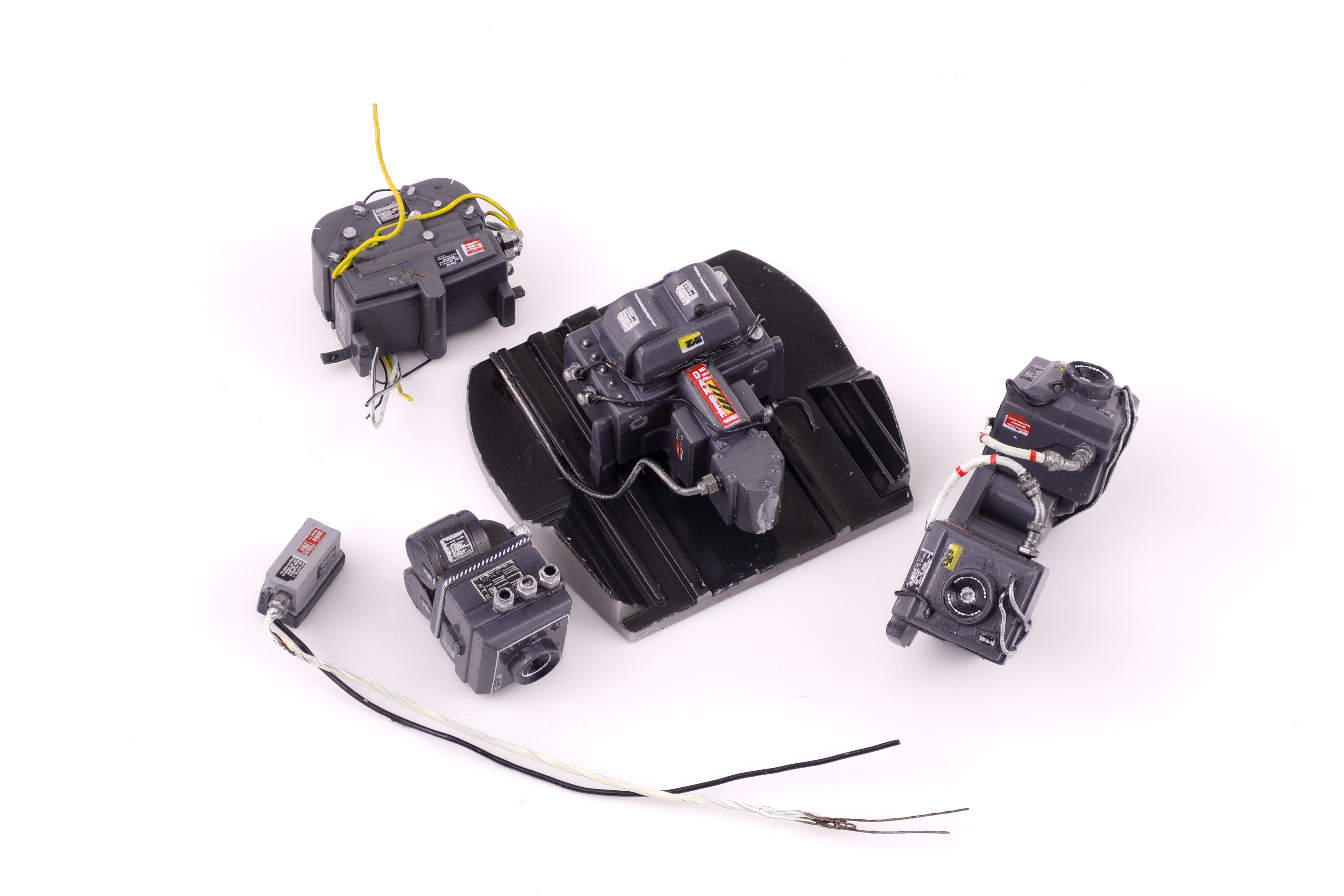 After the grey base colour had cured, I masked off the side consoles to airbrush them black. From reference photos I could tell that some of the switches and dials were gloss black which I wanted to replicate, even at the cost of being less visually striking. To compensate I painted these side panels in a dark grey. When next to the light grey they will appear black, but the gloss black switches should stand out at bit more. I also took this time to paint up the various wires and cables present on the rear bulkheads, painting them in a variety of black, white, and metallic colours.